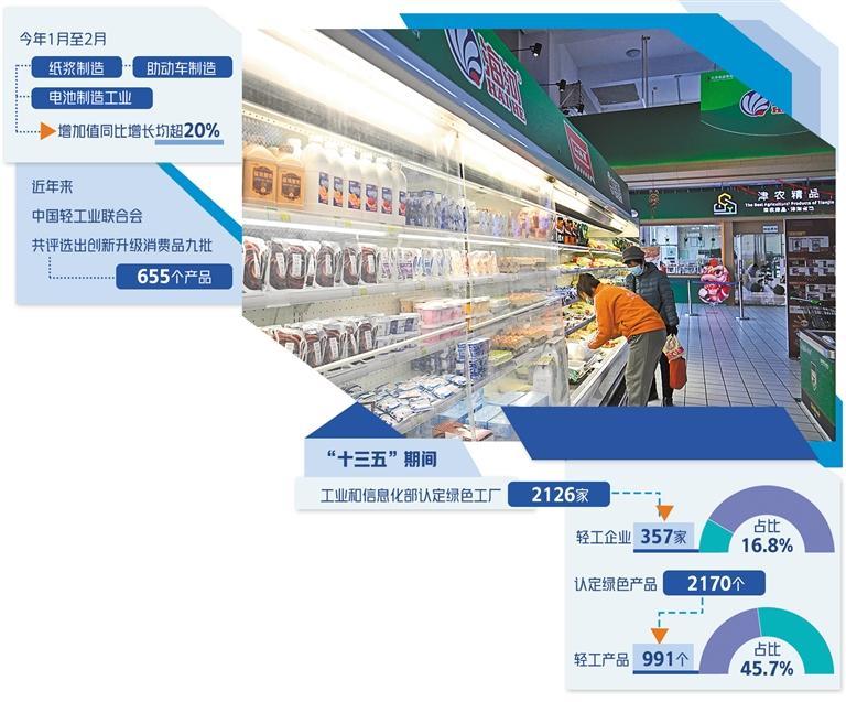 轻工业作为市场消费的主要支撑产业,是扩大内需的基本盘和主力军。据统计,2022年,我国轻工业增加值占全国工业增加值的16.2%,100余种轻工产品产量居世界第一。今年1月至2月,轻工业中的纸浆制造、助动车制造和电池制造工业增加值同比增长均超过20%。