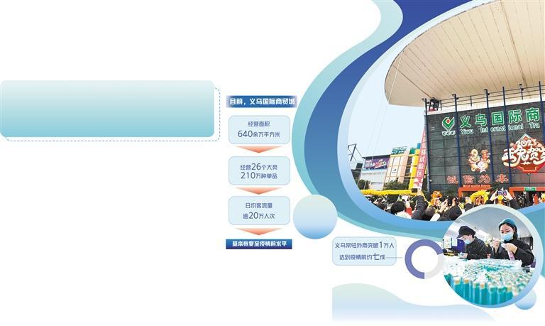 据统计,目前,义乌国际商贸城经营面积640余万平方米,经营26个大类210万种单品,日均客流量逾20万人次,基本恢复至疫情前水平。