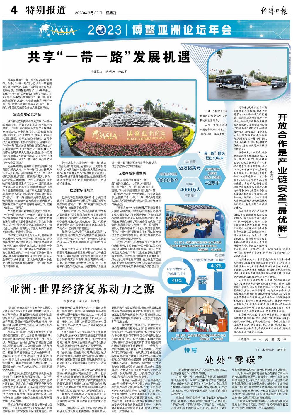 今年是共建“一带一路”倡议提出10周年。如今,“一带一路”倡议已成为一项重要的全球公共产品,丰富了国际发展合作的机制和内容。在博鳌亚洲论坛2023年年会上,共建“一带一路”成为嘉宾们热议的话题。在3月28日下午举行的主题为“一带一路:共享发展机遇”的论坛中,与会嘉宾表示,期待“一带一路”能够书写更多发展奇迹,为“一带一路”共建国家间经贸合作注入强劲新动能。