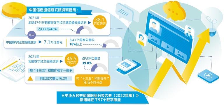 如今,很多传统行业都有像钱荣萍这样的从业者,依托数字经济找到了职业发展新路径。2022年9月,《中华人民共和国职业分类大典(2022年版)》发布。中国职业技术教育学会副会长陈李翔表示,新版国家职业分类大典中,新增职业168个,取消10个,净增158个;共标注了97个数字职业,占职业总数的6%。“之所以在2019年修订职业分类大典后,时隔3年再次修订职业分类大典,是因为数字经济深刻影响了生产方式、企业组织和产品模式等,我们需要有新的职业分类来反映这个时代的变革。”陈李翔说。