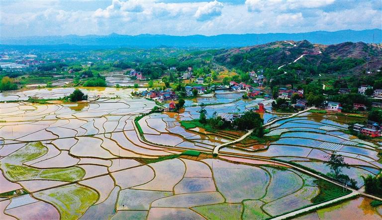 3月30日,重庆市梁平区双桂街道盐河村,蓄足水的田地与蓝天白云及农舍构成美丽画卷。随着气温回升,当地水利部门积极做好水库、塘坝等水利工程蓄水保水工作,为春耕生产提供有力支撑。刘 辉摄(中经视觉)