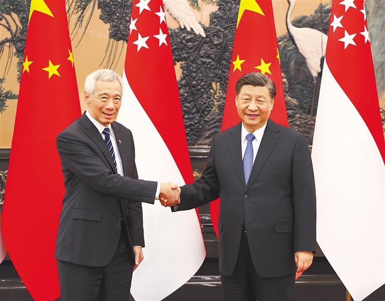 习近平指出,中新是重要合作伙伴,中新关系始终展现出前瞻性、战略性、示范性,不仅有力推动了两国各自发展振兴,也为地区国家树立了标杆。中方把新加坡置于周边外交优先方向。你此次访华期间,我们把中新关系提升为全方位高质量的前瞻性伙伴关系,为两国关系未来发展指明了方向。中方愿同新方加强战略沟通,深化战略对接,切实使“高质量”成为中新合作最鲜明的标识。