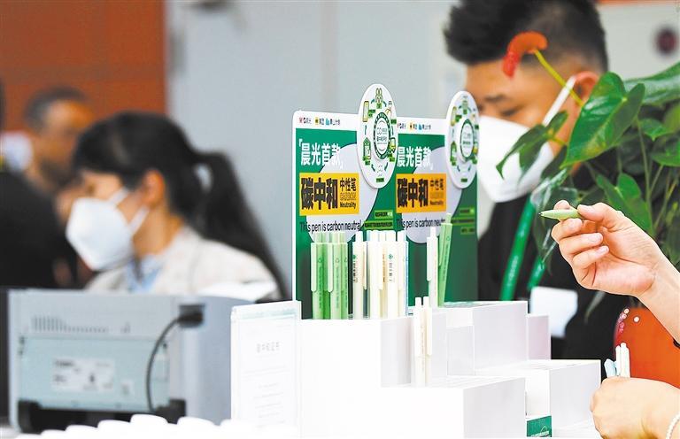 ◀3月28日,媒体记者在博鳌亚洲论坛新闻中心体验碳中和中性笔,它的笔身用回收餐盒再造的再生塑料制作。