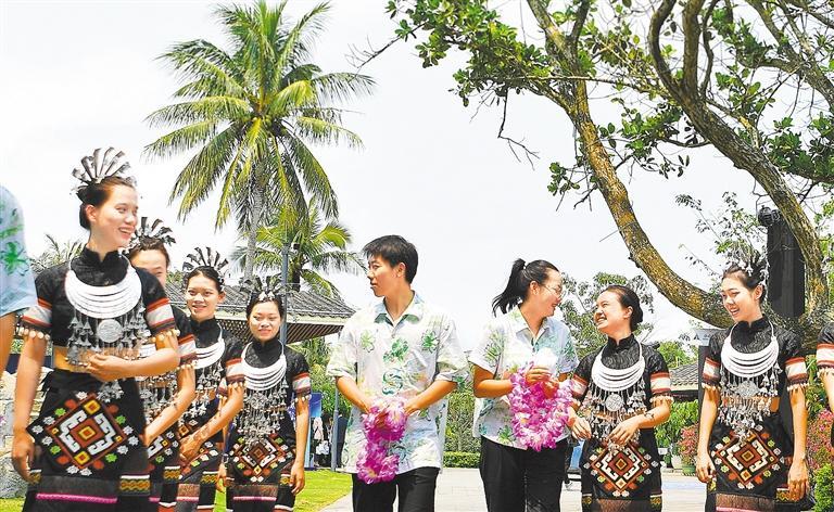 ◀3月30日,博鳌亚洲论坛2023年年会上身着民族服饰的工作人员。年会中,特色文化受到嘉宾关注和喜爱。