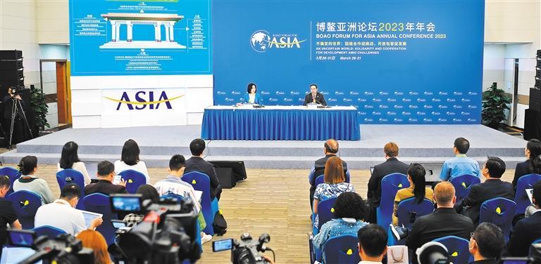 ▼3月29日,博鳌亚洲论坛2023年年会新闻中心,海南省新闻办公室举行“蓬勃兴起正当时——海南全面深化改革开放五年来进展成效”首场新闻发布会。