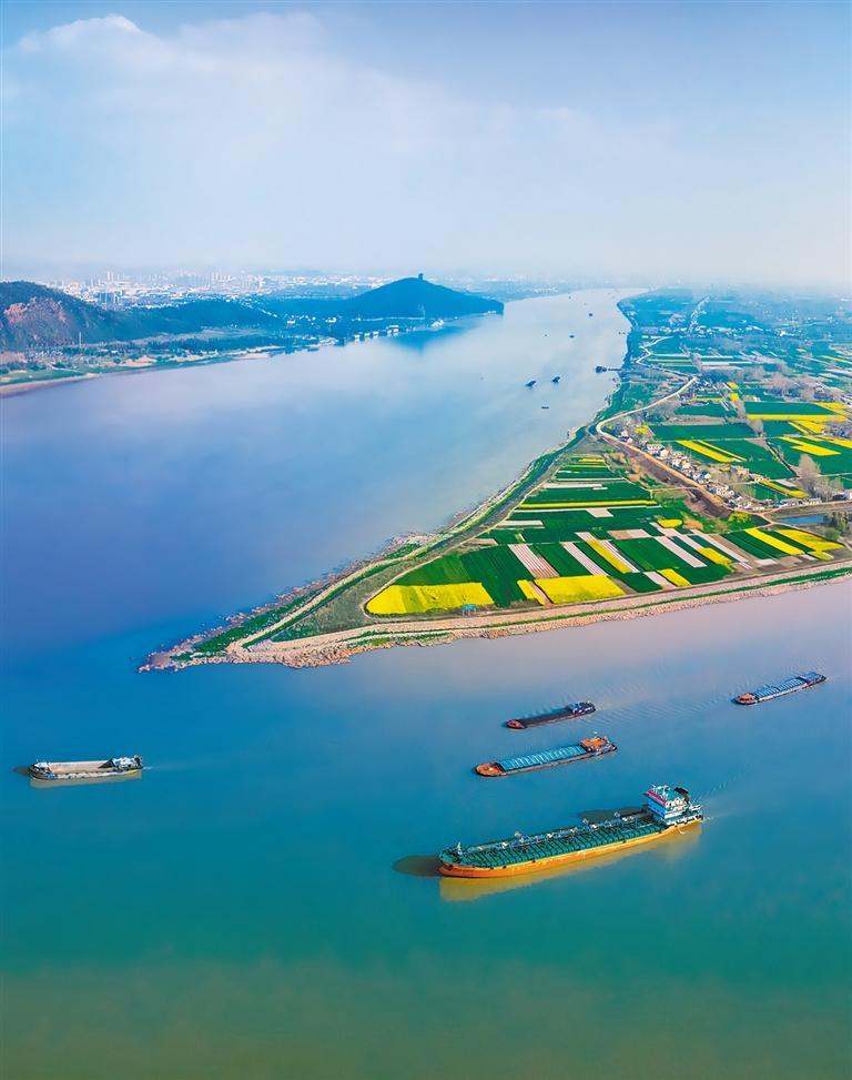 4月1日,安徽省马鞍山市长江岸线边油菜花盛开,江上船行如梭,一派生机勃勃的春日图景。张明伟摄(中经视觉)
