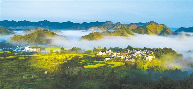 4月1日拍摄的安徽省绩溪县家朋乡梅干岭梯田油菜花。近年来,当地结合美丽乡村建设和特色民俗活动,开展农村生态环境整治,加大道路、水利等基础设施建设,打造生态良好、环境优美、生活富裕的美丽新农村。
