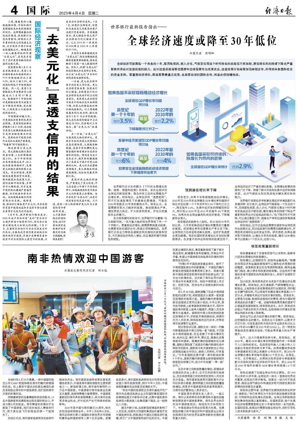 世界银行近日发布题为《下行的长期增长前景:趋势、期望和政策》的报告,首次全面评估全球经历新冠疫情、俄乌冲突之后的长期潜在产出增长率。报告指出,全球经济的“速度极限”,即不引发通胀情况下的最高长期增速,可能在2030年前跌至30年来的最低水平。报告认为,各国需要采取大刀阔斧的政策,推动提高生产率,增加劳动力供应,扩大投资和贸易,并充分挖掘服务业的潜力。