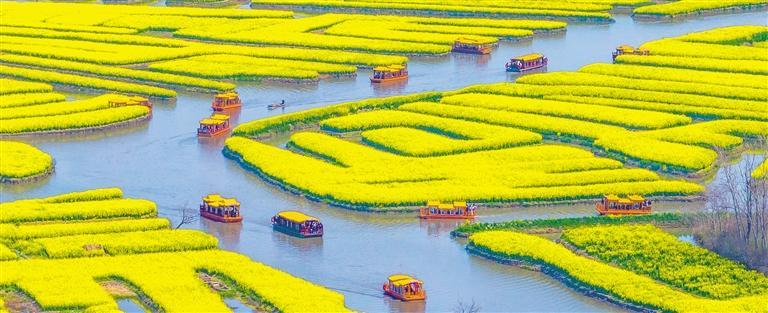 4月2日,江苏省泰州市兴化垛田油菜花进入盛花期。满载游客的游船在垛田花海穿行,构成了一幅美丽的水乡生态画。