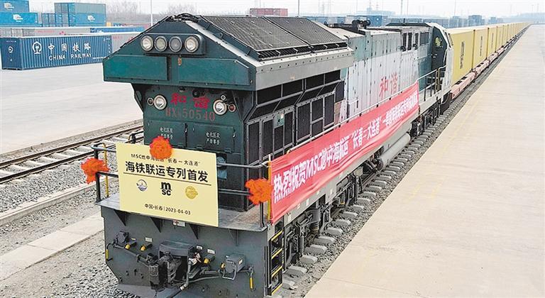4月3日,吉林省首次运用“一单制”海铁联运物流新模式的“长春—大连港”45516次外贸班列从长春兴隆山营业站驶出。王作超摄(中经视觉)