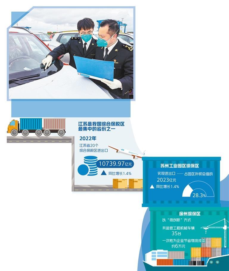 一年来,面对复杂严峻的外部环境和新冠疫情冲击,在南京海关的积极指导参与下,江苏省内各个综合保税区充分运用政策功能优势,稳定主导产业,为企业减负纾困,实现了综合保税区高水平开放和高质量发展。据统计,2022年江苏省20个综合保税区进出口总额为10739.97亿元,同比增长1.4%。