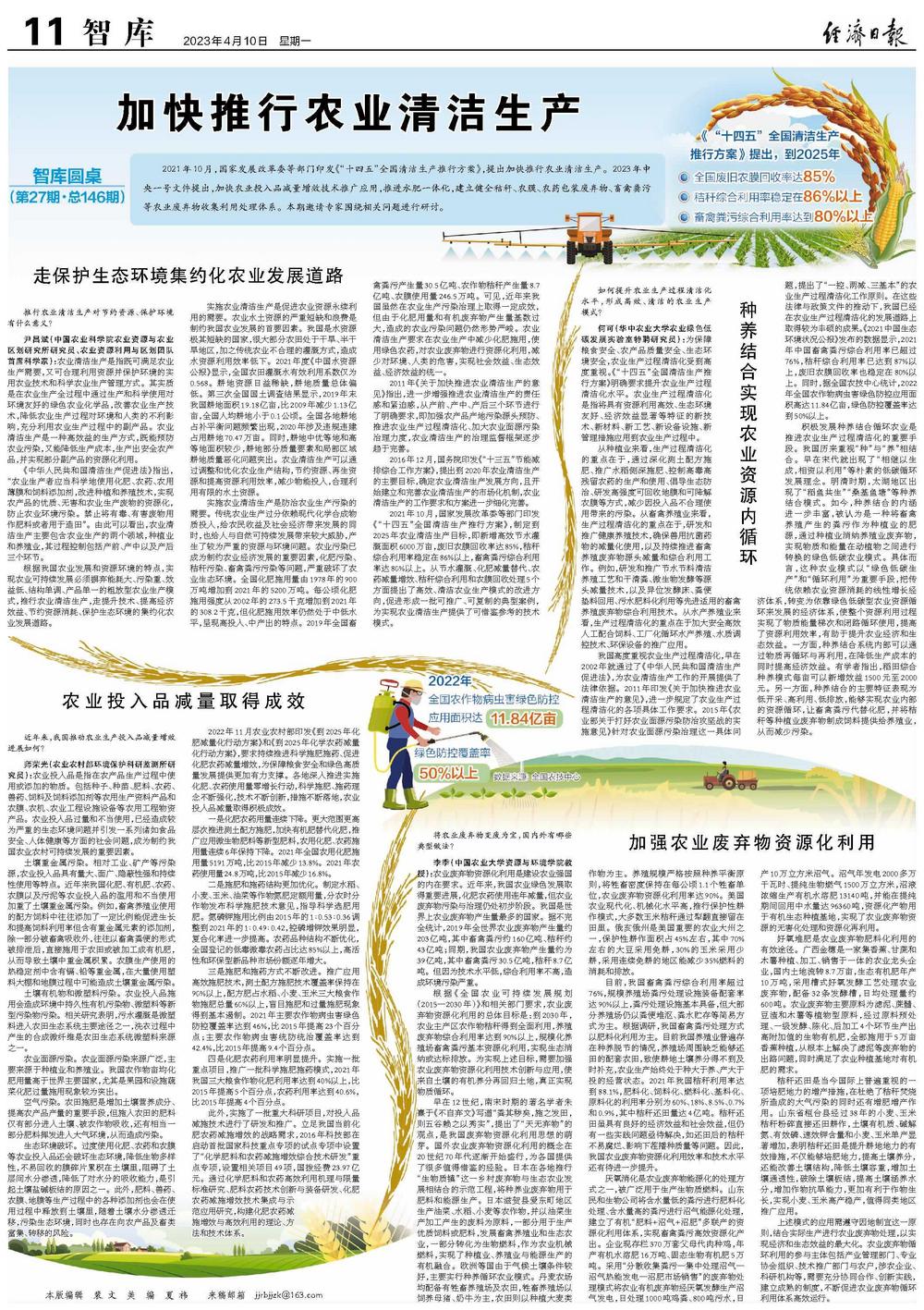 2021年10月,国家发展改革委等部门印发《“十四五”全国清洁生产推行方案》,提出加快推行农业清洁生产。2023年中央一号文件提出,加快农业投入品减量增效技术推广应用,推进水肥一体化,建立健全秸秆、农膜、农药包装废弃物、畜禽粪污等农业废弃物收集利用处理体系。本期邀请专家围绕相关问题进行研讨。