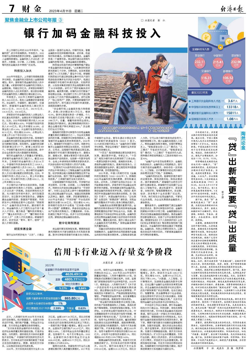 在上市银行公布的2022年年报中,“金融科技”成为年报高频词。年报显示,2022年银行业持续推进数字化转型,金融科技投入金额持续增加,金融科技人才占比进一步提升,大数据、云计算、人工智能、区块链等科技在金融实务中得到广泛运用。