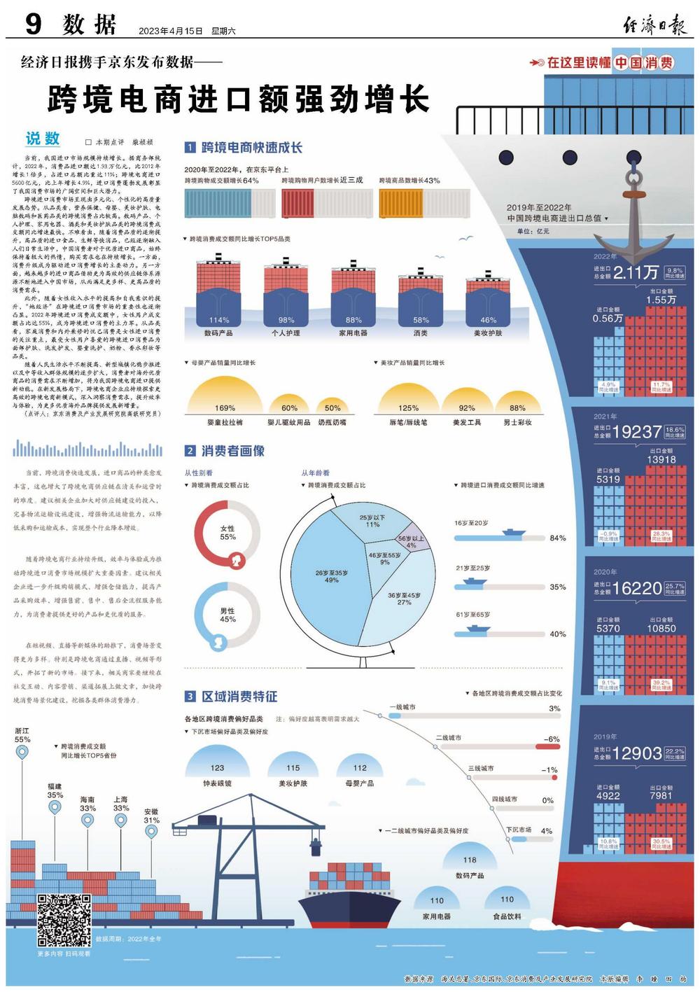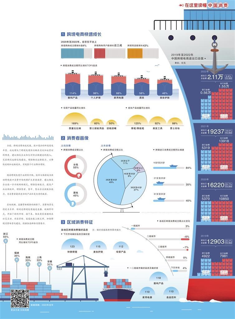 当前,我国进口市场规模持续增长。据商务部统计,2022年,消费品进口额达1.93万亿元,比2012年增长1倍多,占进口总额比重达11%;跨境电商进口5600亿元,比上年增长4.9%,进口消费蓬勃发展彰显了我国消费市场的广阔空间和巨大潜力。