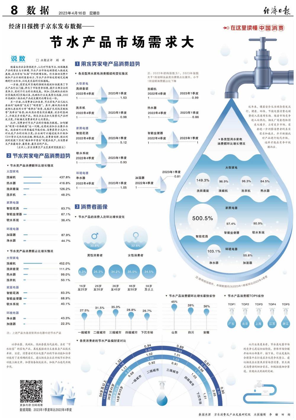 此外,消费者对节水产品的价格较为敏感。如何解决“刚需+价格敏感”这一问题,还需政府和企业携手共促。政府端可以考虑通过节能补贴、消费券等方式加大对此类产品的补贴力度;企业端可以通过技术升级和C2M等方式优化供应链、降低成本,在尊重创新、保证利润的前提下实现“精准命中需求”的商品投产,为消费者生产出最适合、最需要、最实在的产品。