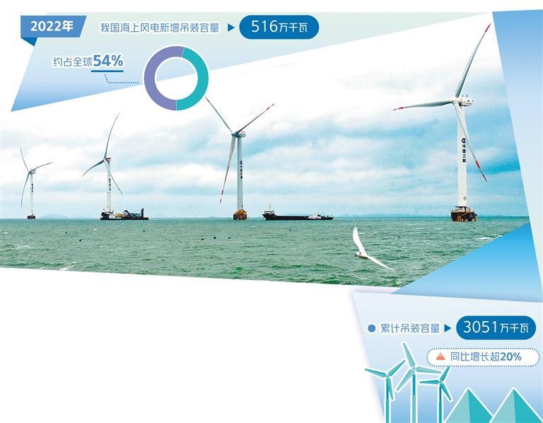 近年来,我国海上风电装机容量持续增长。2022年我国海上风电新增吊装容量516万千瓦,约占全球的54%;累计吊装容量3051万千瓦,同比增长超过20%,持续保持全球第一位。风机大型化趋势明显,从2011年至2021年,国内新增海上风电平均单机容量从2.7兆瓦提升至5.6兆瓦,2022年下线的新型海上风电机组的平均单机容量已达11.5兆瓦。