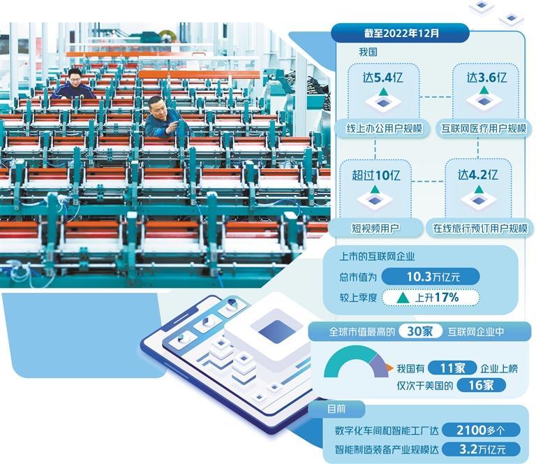 数实融合也为数字经济发展带来更多动力。中国信息通信研究院发布的《中国数字经济发展报告(2022年)》数据显示,2021年我国数字经济规模达到45.5万亿元,占GDP比重达到39.8%,高于同期GDP名义增速3.4个百分点,数字经济已成为国民经济的重要组成部分,支撑作用愈发明显。截至2022年12月,我国上市的互联网企业总市值为10.3万亿元,较上季度上升17%。全球市值最高的30家互联网企业中,我国有11家企业上榜,仅次于美国的16家。