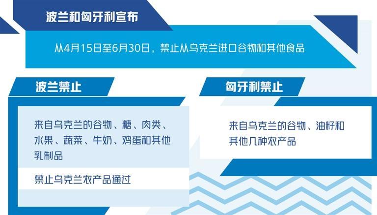 4月15日,波兰和匈牙利两国相继宣布从即日起到6月30日,禁止从乌克兰进口谷物和其他食品,以保护当地农民利益。波兰禁止进口乌克兰的谷物、糖、肉类、水果、蔬菜、牛奶、鸡蛋和其他乳制品,同时还禁止乌克兰农产品通过。匈牙利禁止进口谷物、油籽和其他几种农产品。