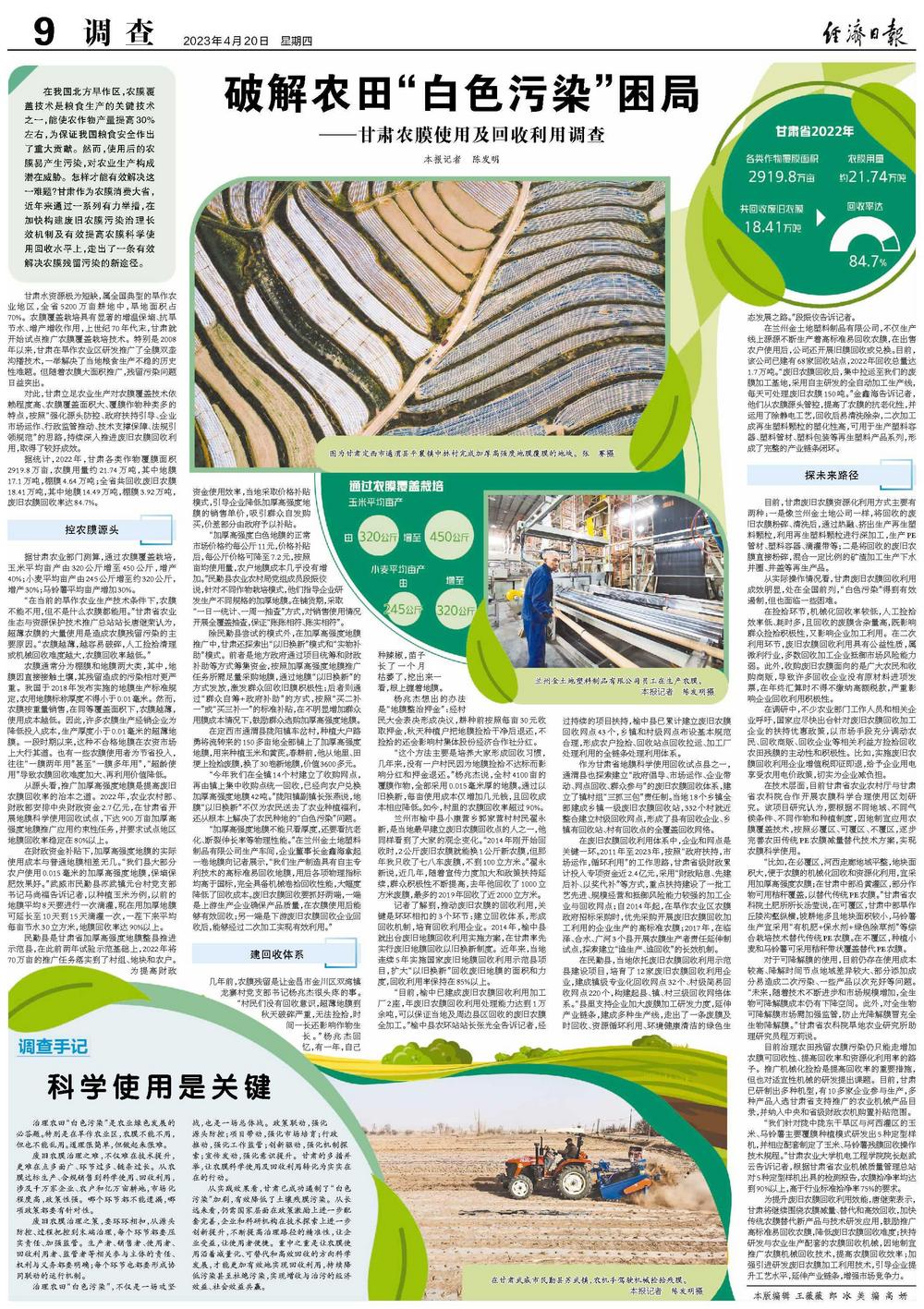 据统计,2022年,甘肃各类作物覆膜面积2919.8万亩,农膜用量约21.74万吨,其中地膜17.1万吨,棚膜4.64万吨;全省共回收废旧农膜18.41万吨,其中地膜14.49万吨,棚膜3.92万吨,废旧农膜回收率达84.7%。