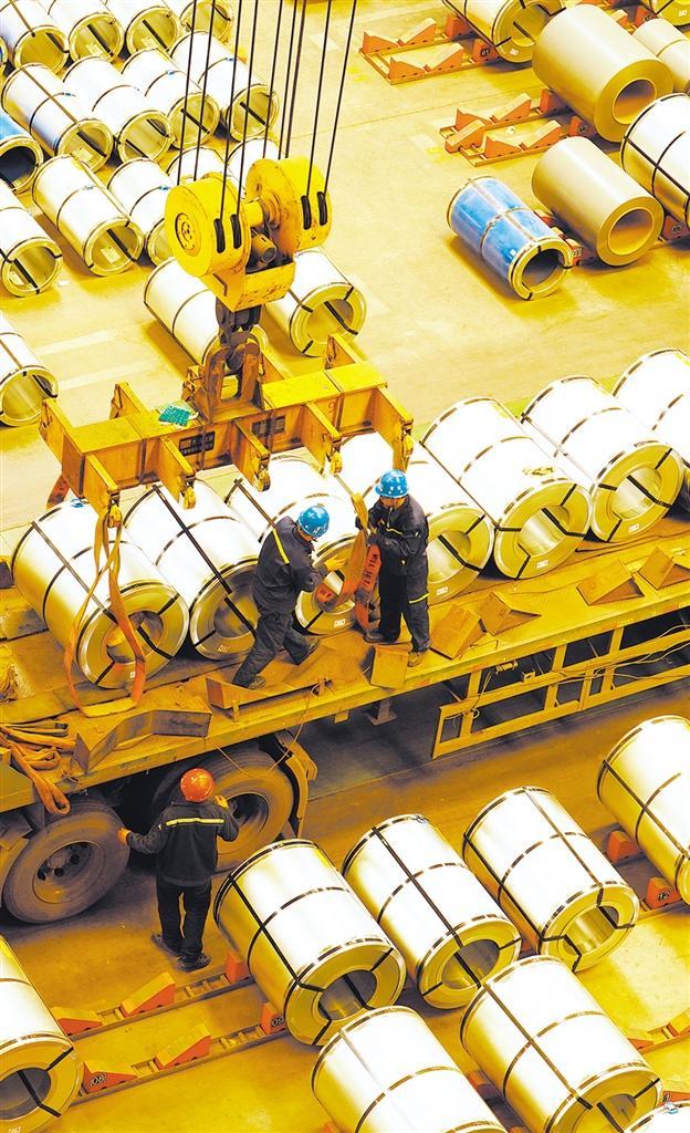 4月19日,河北迁安经济开发区,工人在首钢智新迁安电磁材料有限公司车间调运电工钢产品。当日,首钢智新电磁高性能取向电工钢专业化产线投产暨新产品全球首发仪式举行。本报记者 王胜强摄