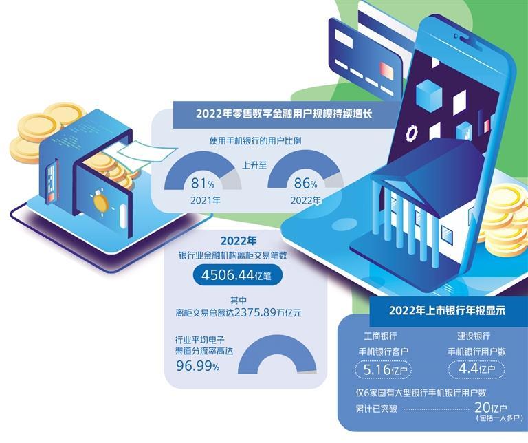 中国银行业协会日前发布的《2022年中国银行业服务报告》也印证了离柜率的上升。2022年银行业金融机构离柜交易笔数达4506.44亿笔。其中,离柜交易总额达2375.89万亿元,行业平均电子渠道分流率高达96.99%。
