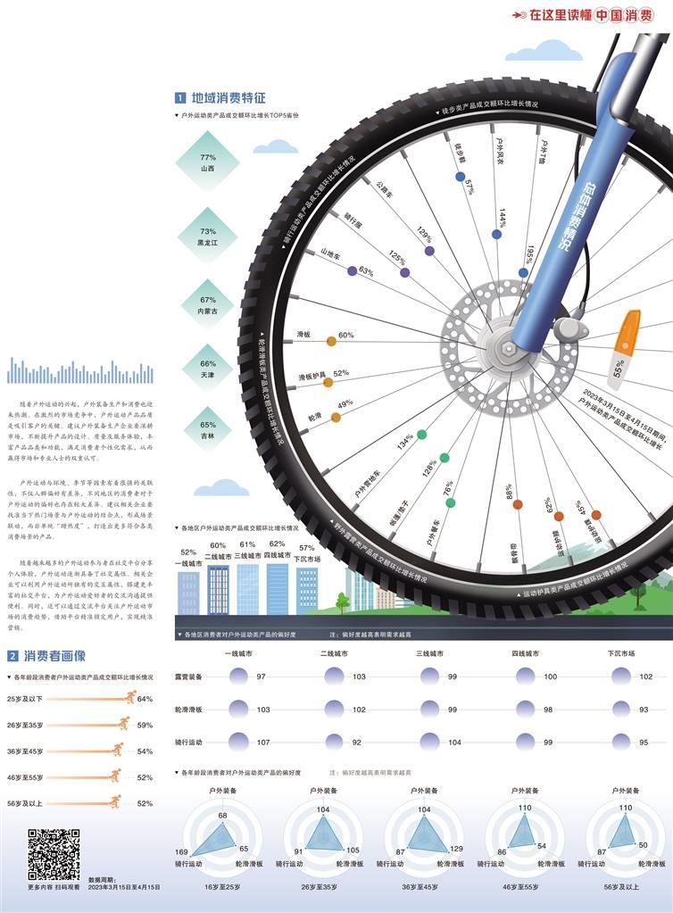 一方面,在户外运动高速发展的趋势下,新的消费人群与消费习惯正在形成。从年龄上看,户外运动不再是年轻人的专属领域,“银发族”群体逐渐崛起。从地域上看,一二线城市消费者在户外运动上的消费依然强劲,下沉市场消费者也展现出一定潜力。建议相关企业根据消费者需求,研发符合不同群体消费习惯的产品,快速抢占市场。