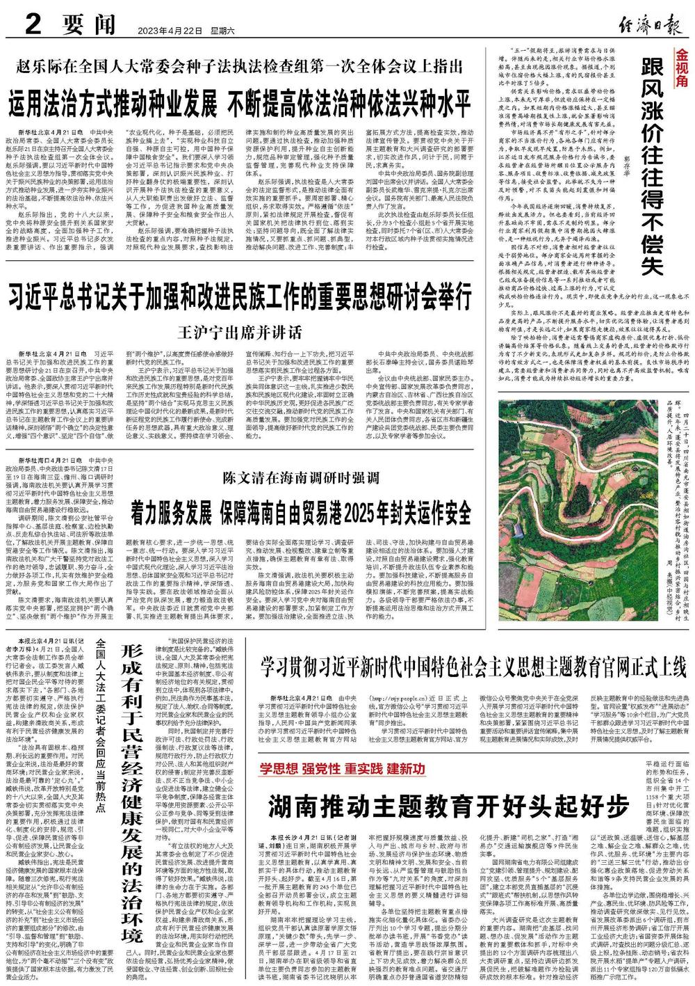 新华社北京4月21日电 习近平总书记关于加强和改进民族工作的重要思想研讨会21日在京召开,中共中央政治局常委、全国政协主席王沪宁出席并讲话。他表示,要深入贯彻习近平新时代中国特色社会主义思想和党的二十大精神,学深悟透习近平总书记关于加强和改进民族工作的重要思想,认真落实习近平总书记在主题教育工作会议上的重要讲话精神,深刻领悟“两个确立”的决定性意义,增强“四个意识”、坚定“四个自信”、做到“两个维护”,以高度责任感使命感做好新时代党的民族工作。