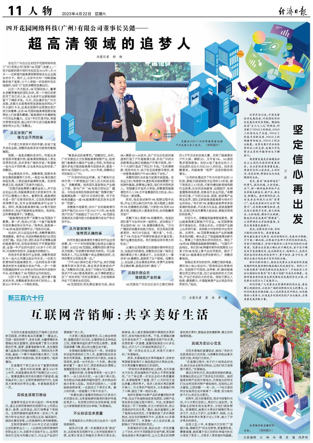 以这一天为起点,4K花园创始人、董事长吴懿带着他的团队伙伴,用一个绚烂的梦改写了自己的人生,也为诸多行业赋能焕新留下了精彩手笔。今天,无论漫步在广州北京路、成都太古里等商贸旅游胜地的网红户外大屏打卡点,还是在视频平台观赏纪录片或文体赛事,出自4K花园的超高清视频总能带给人们惊喜和震撼。“超高清技术有着赋能千行百业的魔力。过去7年仅仅是开始,希望对梦想的坚持,能让我们早日成为超高清领域的伟大公司。”吴懿说。