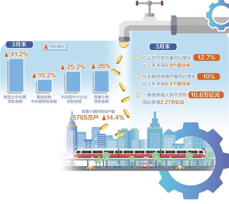 一季度金融数据的亮眼表现,离不开结构性货币政策工具的积极引导。“截至今年3月末,17项结构性货币政策工具余额大约为6.8万亿元,有效引导了金融机构合理投放贷款,促进金融资源向重大领域和薄弱环节倾斜。”邹澜表示。