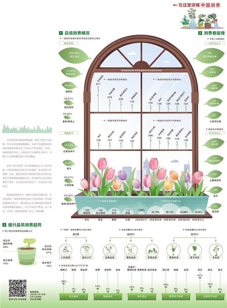 数据显示,2023年春季,一线城市农资园艺消费增长明显,除了绿植花卉和果蔬种子,花盆、营养土、肥料、园艺工具都成了热销品。有人在阳台上种花,有人在阳台上植树,但人们买的最多的是果蔬种子。在阳台种菜,可以像养花一样,观其形、闻其香,需要的时候摘几片还能尝其味,体验“自己动手,丰衣足食”的乐趣。