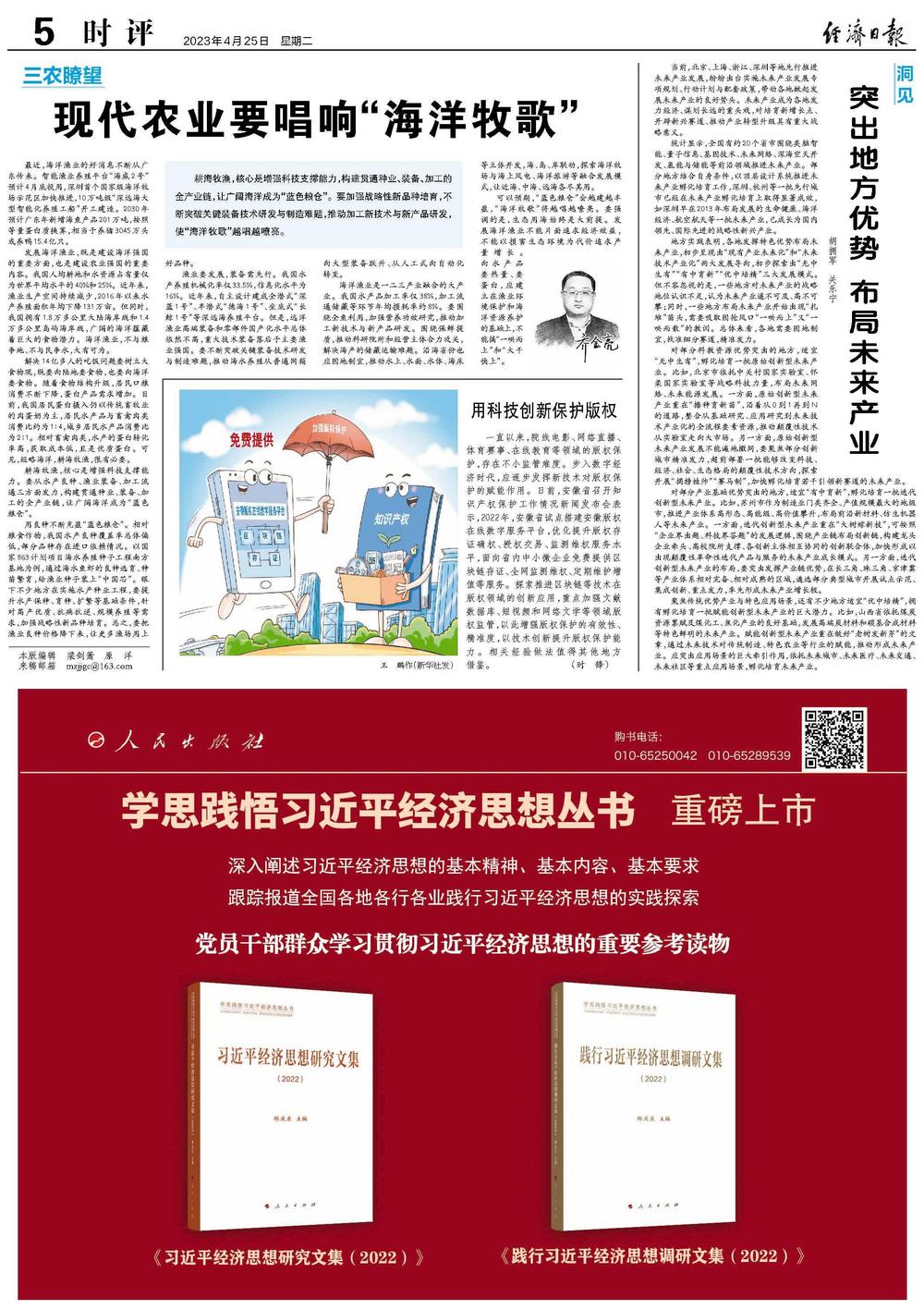 海洋渔业是一二三产业融合的大产业。我国水产品加工率仅38%,加工流通储藏等环节年均损耗率约8%。要围绕全鱼利用,加强营养功效研究,推动加工新技术与新产品研发。围绕保鲜提质,推动科研院所和经营主体合力攻关,解决海产的储藏运输难题。沿海省份也应因地制宜,推动水上、水面、水体、海床等立体开发,海、岛、岸联动,探索海洋牧场与海上风电、海洋旅游等融合发展模式,让近海、中海、远海各尽其用。