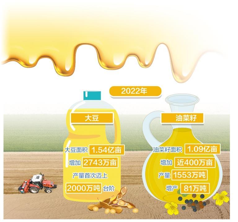 提高大豆油料自给率是确保粮食和重要农产品稳定安全供给的重要内容。今年的中央一号文件将“加力扩种大豆油料”作为主要任务之一。自去年国家启动实施大豆和油料产能提升工程以来,大豆油料扩种取得了明显成效,种植面积、产量均明显增加。据统计,2022年,我国大豆面积达到1.54亿亩,增加2743万亩,产量首次迈上2000万吨台阶;油菜籽面积达到1.09亿亩,比上年增加近400万亩,产量达到1553万吨,增产81万吨。今年,农业农村部多措并举推动大豆油料提产增效。
