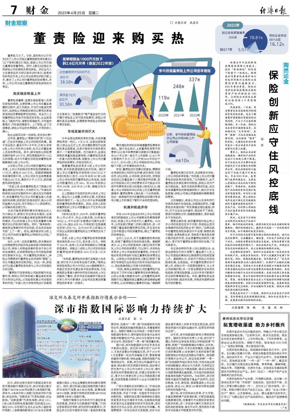 业内人士认为,关于独董制度改革的政策,助推了董责险市场的快速发展。潘韶辉表示,从上市公司层面来讲,《意见》有利于激发上市公司的投保需求,可以预计,未来将会有更多上市公司选择投保董责险,市场也可能会有更多单独针对独立董事的投保需求出现。从保险公司层面来讲,《意见》表明了国家引导保险行业协同应对资本市场风险的决心,将会提高保险公司参与的积极性。