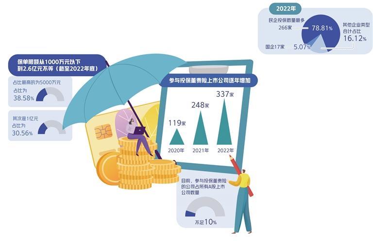 随着董责险走进更多A股上市公司的视野,其市场渗透程度也逐步加深。据《中国上市公司董责险市场报告(2023)》(以下简称《报告》)显示,2022年共有337家A股上市公司发布购买董责险的公告信息,投保公司数量同比上升36%。而2021年投保公司为248家、2020年为119家,增幅分别为108%、205%。