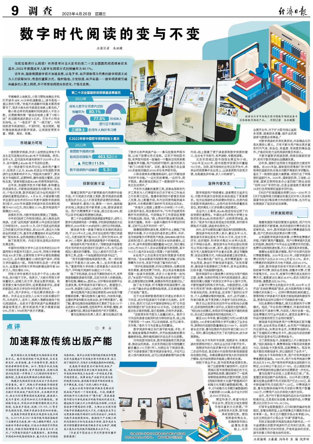 近年来,随着我国数字技术加速发展,以电子书、有声读物等为代表的数字阅读正成为人们获取知识、信息的重要方式。随时随地、方便快捷、有声有画……数字阅读吸引越来越多的人爱上阅读,并不断推动阅读向系统化、个性化发展。