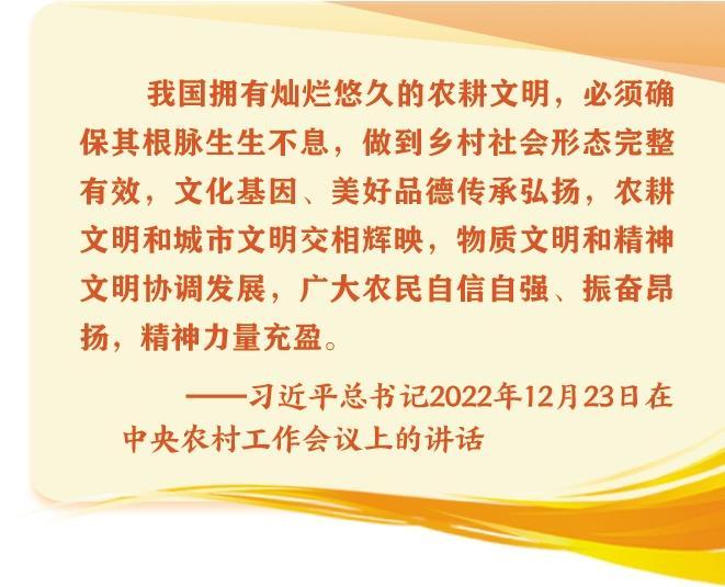 我国农耕文明源远流长、博大精深,承载着中华文明生生不息的基因密码,彰显着中华民族的思想智慧和精神追求。习近平总书记在中央农村工作会议上指出,“我国拥有灿烂悠久的农耕文明,必须确保其根脉生生不息,做到乡村社会形态完整有效,文化基因、美好品德传承弘扬,农耕文明和城市文明交相辉映,物质文明和精神文明协调发展”。党的二十大报告提出:“加快建设农业强国,扎实推动乡村产业、人才、文化、生态、组织振兴。”推进有中国特色的农业强国建设,必须立足农耕文明的历史底蕴,系统挖掘农耕文化深层价值,积极探索乡村文化振兴,加强农村精神文明建设,从优秀农耕文化中汲取乡村振兴的精神力量。