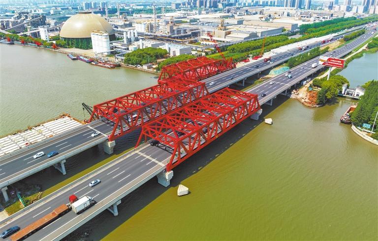 4月27日,江苏省重点工程沪宁高速公路青阳港大桥改造升级工程南半幅正进行紧张施工,预计今年9月全线通车。届时申张线青阳港段航道将从五级航道提升为三级航道,提升青阳港水运通航能力。张从余摄(中经视觉)