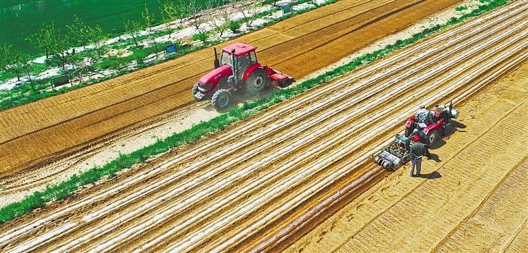 四月二十七日,山东省荣成市虎山镇,虎山农业种植合作社的农民驾驶农机播种花生。随着气温升高,花生种植大市荣成的花生机械化播种工作正稳步推进。王福东摄(中经视觉)