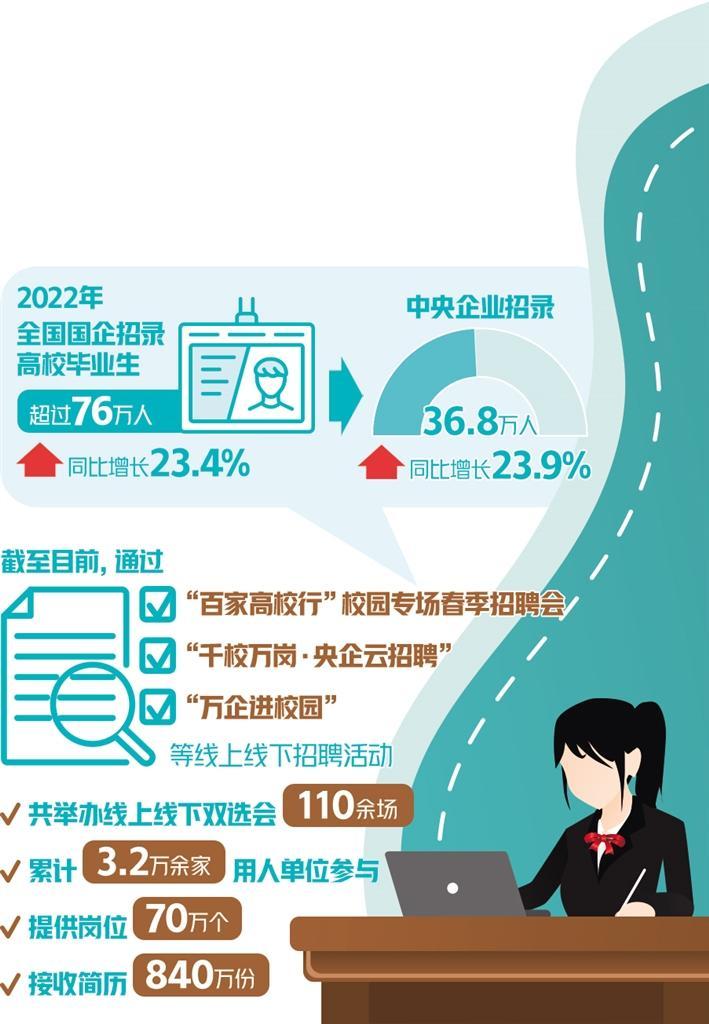 2022年,全国国企招录高校毕业生超过76万人、同比增长23.4%,其中,中央企业招录36.8万人、同比增长23.9%。国资委社会责任局局长李军介绍,今年正在推动国有企业努力吸纳高校毕业生就业,截至目前,通过“百家高校行”校园专场春季招聘会、“千校万岗·央企云招聘”、“万企进校园”等线上线下招聘活动,共举办110余场线上线下双选会,累计3.2万余家用人单位参与,提供岗位70万个,接收简历840万份。“下一步,国资委还将对中央企业公开、平等、竞争、择优录用人才提出明确要求,坚决防止就业歧视行为,更好延揽各方面优秀人才。”