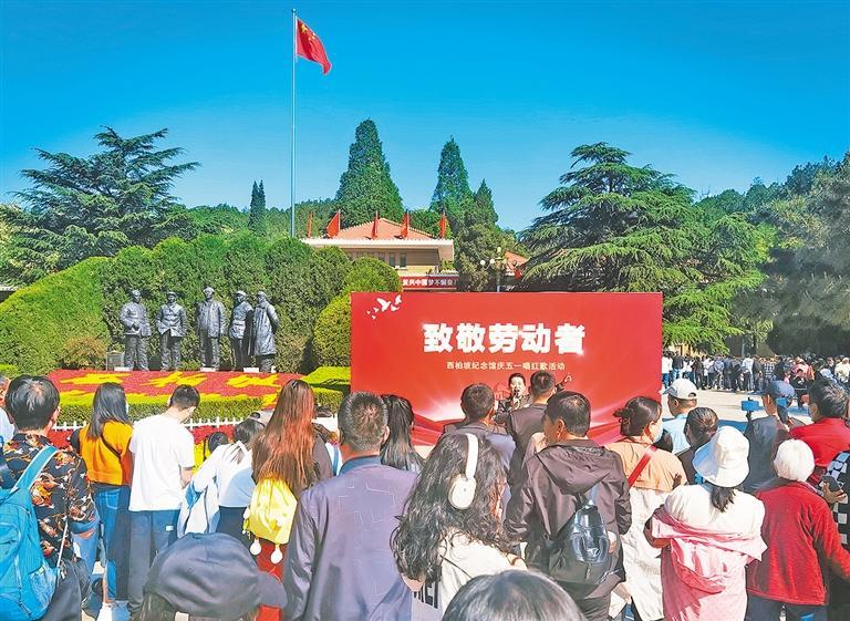 4月30日,河北省石家庄市西柏坡纪念馆开展“致敬劳动者”活动,庆“五一”,唱红歌,吸引众多游客参与。“五一”假期,众多游客来到西柏坡景区参观学习,开展党建活动,接受爱国主义教育。赵建伟摄(中经视觉)