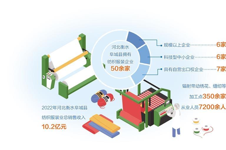 河北衡水阜城县是华北规模最大的服装出口生产基地,拥有纺织服装企业50余家,其中规模以上企业6家、科技型中小企业6家,具有自营出口权企业7家,辐射带动绣花、缝纫等加工点350余家,从业人员7200余人。去年该县纺织服装业总销售收入10.2亿元。