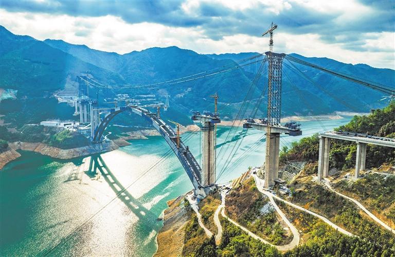 5月3日,广西河池市南丹至天峨下老高速公路天峨龙滩特大桥建设不停歇,工人们赶时间、抢进度,力争实现年底建成通车目标。大桥横跨广西红水河,全长2488.55米,是国家交通运输行业重点科技项目。周恩革摄(中经视觉)