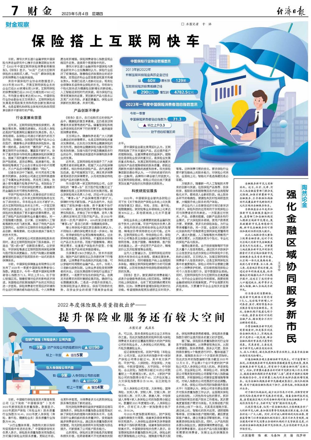 近年来,互联网保险凭借投保便利、易触达等优势,规模迅速增长。无论是人身险还是财产险都展现出蓬勃的发展态势。在人身险领域,各保险公司通过不断迭代的百万医疗险、防癌险、住院医疗险等产品为公众在医疗、健康等众多场景提供保险服务。值得一提的是,各城市的“惠民保”产品,依靠互联网平台的推动,覆盖面不断扩大,弥补了基本医保与传统商业健康保险的保障空白,提高了居民重特大疾病的保障水平。在财产险领域,退货运费险、旅游意外险、宠物保险等满足了公众在日常生活中的不同需求,不少产品成为频繁出圈的“网红”。