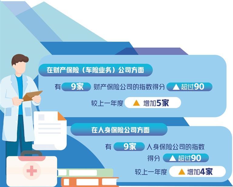 在人身保险公司方面,太保寿险、国寿寿险、友邦人寿、安联人寿、交银人寿、财信吉祥人寿、太平人寿、泰康人寿、中信保诚人寿等9家人身保险公司的指数得分超过90,数量较2021年度增加4家。人身保险公司中,仅有汇丰人寿一家指数得分低于60,为50.24。