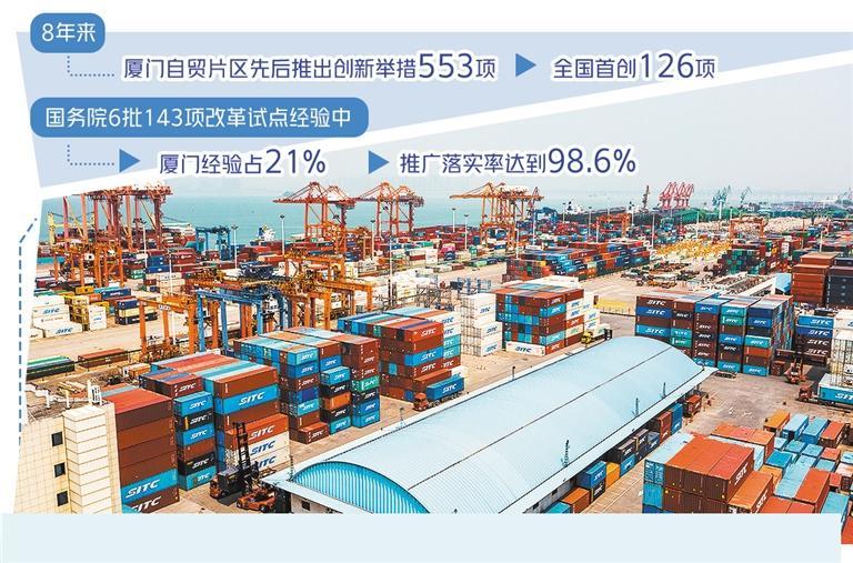 先后推出创新举措553项,全国首创126项;厦门国际贸易“单一窗口”等5个典型案例成为全国自贸试验区最佳实践案例,占全国8%;国务院6批143项改革试点经验中,厦门经验占21%,推广落实率达到98.6%;福建省9批193项自贸试验区创新成果中,厦门经验占64.2%,推广落实率达到95.8%……8年来,厦门自贸片区积极作为,为打造市场化、法治化、国际化一流营商环境作出了贡献。