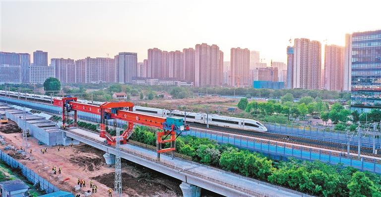 5月7日,济(南)郑(州)高铁山东段最后一榀箱梁在中铁十局站前I标顺利架设完成,至此,济郑高铁山东段完成全部箱梁架设工作,全面转入铺轨阶段。济郑高铁是国家“八纵八横”高铁网重要组成部分。项目通车后,济南到郑州的通行时间将缩短至1.5小时。新华社记者 郭绪雷摄
