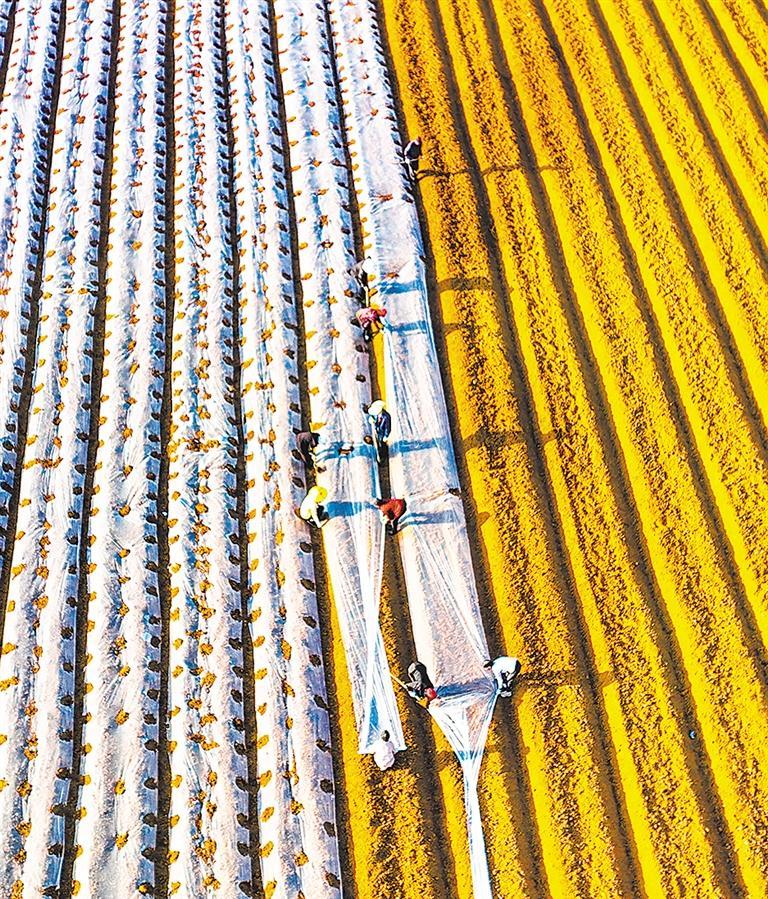 近日,安徽省芜湖市繁昌区峨山镇凤形村农户正在覆盖地膜。当地通过对荒坡和土埂等进行整治,实现撂荒地变良田,为农民增收扩宽渠道。鲁君元摄(中经视觉)