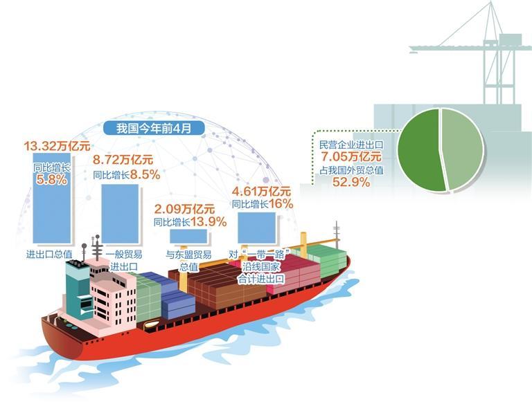 民营企业进出口比重超五成。前4个月,民营企业进出口7.05万亿元,同比增长15.8%,占我国外贸总值的52.9%,比去年同期提升4.6个百分点。国有企业进出口2.18万亿元,同比增长5.7%,占我国外贸总值的16.4%。