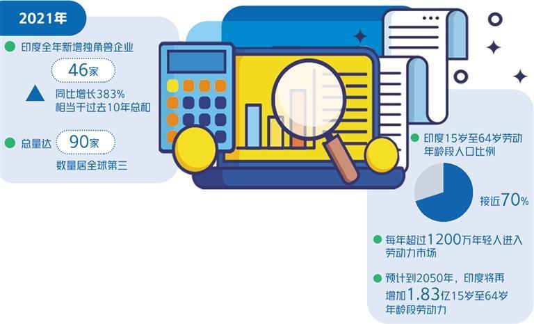 结合目前披露的数据,印度人口预计已超过14.1亿。庞大的人口基数给印度带来了巨大的劳动力优势,15岁至64岁的劳动年龄段人口比例接近70%,每年有超过1200万年轻人进入劳动力市场。据印媒报道,预计到2050年,印度将再增加1.83亿15岁至64岁年龄段的劳动力。这样的人口数量和年龄结构,使得印度国内的创新创业环境享受了红利,尤其体现在数字经济领域,这就为众多独角兽企业的创立和做大奠定了良好的基础。