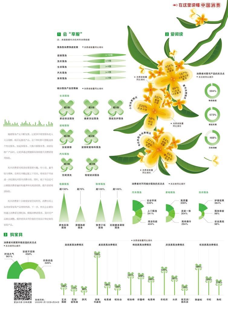 以今年1月1日至4月24日为数据周期,从线上服务消费趋势看,杭州地区的装修服务、洗衣服务、生活服务、汽车服务、体育服务等服务型消费获得快速增长。其中,细分领域服务产品更受消费者青睐,如生活服务中选择家政保洁服务的消费者数量同比增长超5倍,装修服务中选择安装维修的消费者数量同比增长超4倍,汽车服务中选择空调清洗的消费者数量同比增长超3倍。相关服务型企业应加快对细分领域布局,进一步拓展服务范围和服务种类,针对性研发服务产品,满足消费者多元化需求。